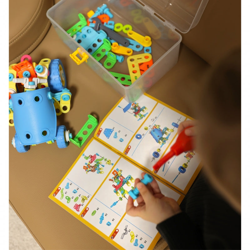 - Komplektā ietilpst: dažādu formu klucīši, skrūvgriezis un atvērta gala uzgriežņu atslēga, stiprināšanas skrūves ar uzgriežņiem, riteņi, ilustrētas instrukcijas 6 dažādu transportlīdzekļu būvēšanai.
