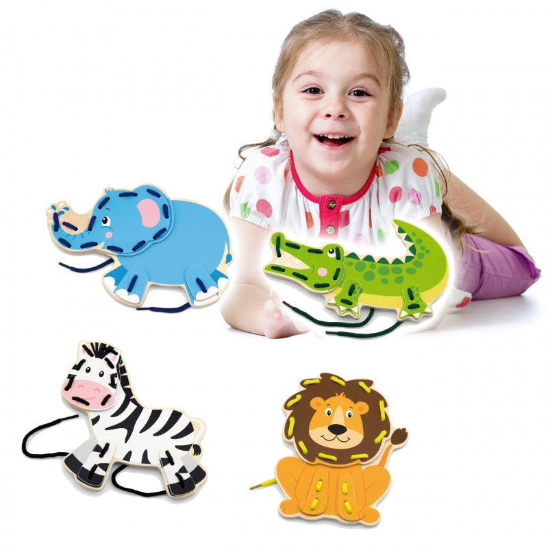 Komplektā ietilpst 22 dažādi elementi šņorēšanai pēc Montesori metodikas - 4 savvaļas dzīvnieki