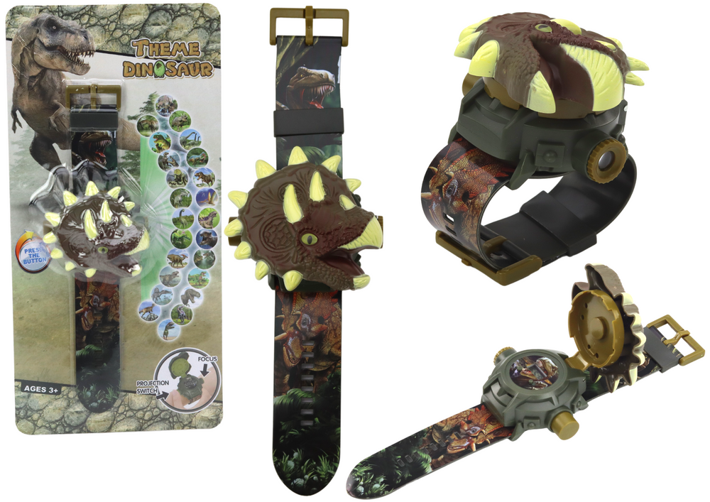 Pulkstenis ir aprīkojums ar 24 dažādiem slaidiem, kas parāda dažādas dinozauru sugas un ainas no dinozauru dzīves.