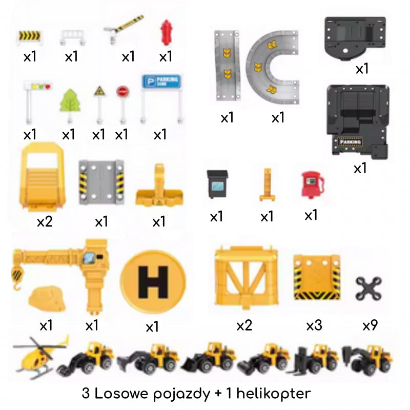 Komplektā ietilpst celtniecības transportlīdzekļi un helikopters dažādu scenāriju izspēlēšanai