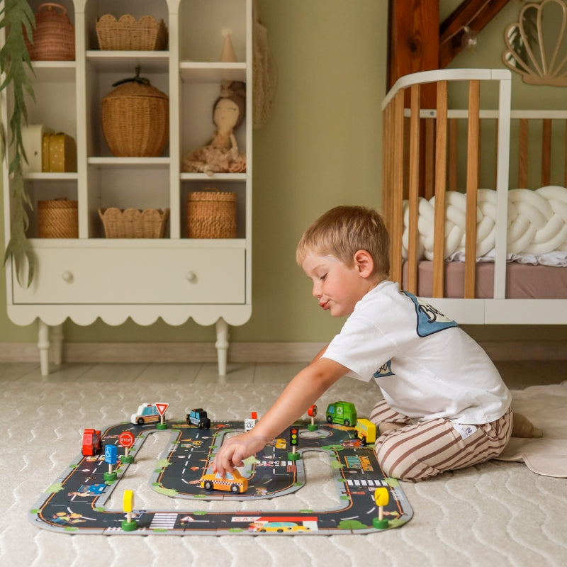 Puzles parāda ielu un tās svarīgākos elementus, piemēram, zīmes un pilsētas satiksmi.